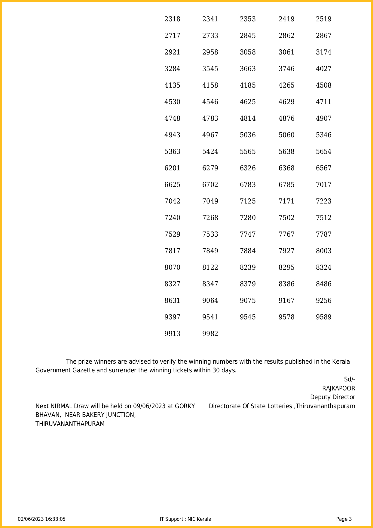 Next Nirmal Lottery Draw Will Be Held On 09/06/2023 At Gorky Bhavan Near Bakery Junction Thiruvananthapuram.